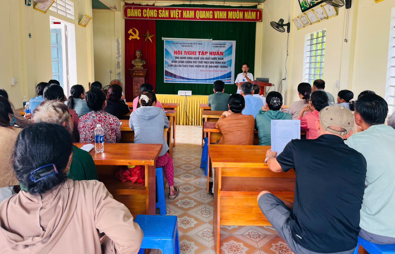 Ngày 26/9/2025, tại xã Nam Cửa Việt, tỉnh Quảng Trị, Liên hiệp các Hội Khoa học và Kỹ thuật tỉnh Quảng Trị phối hợp với UBND xã Nam Cửa Việt tổ chức tập huấn “Ứng dụng công nghệ sản xuất nước mắm bằng năng lượng mặt trời theo chu trình kín, đảm bảo an toàn thực phẩm và vệ sinh môi trường”.