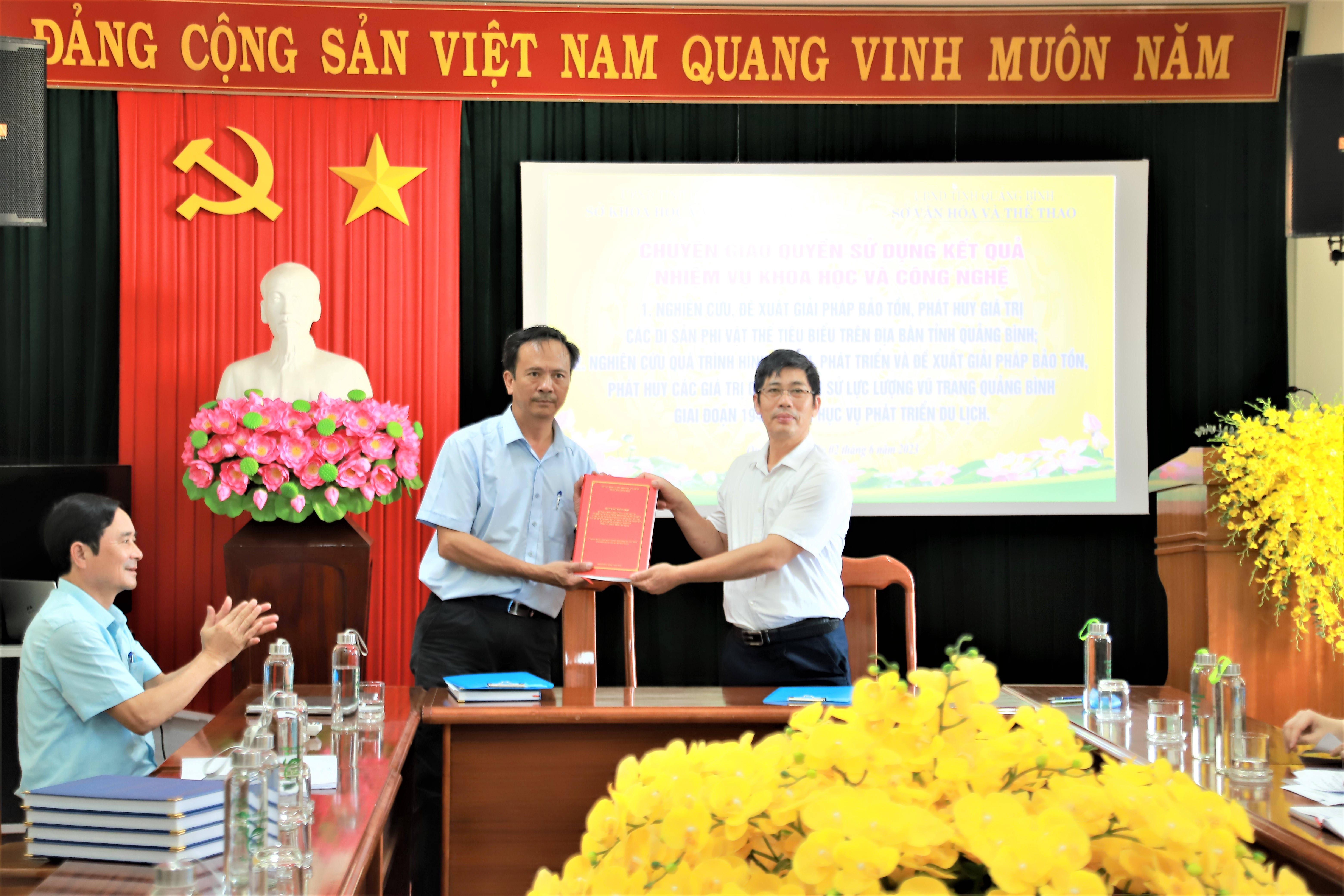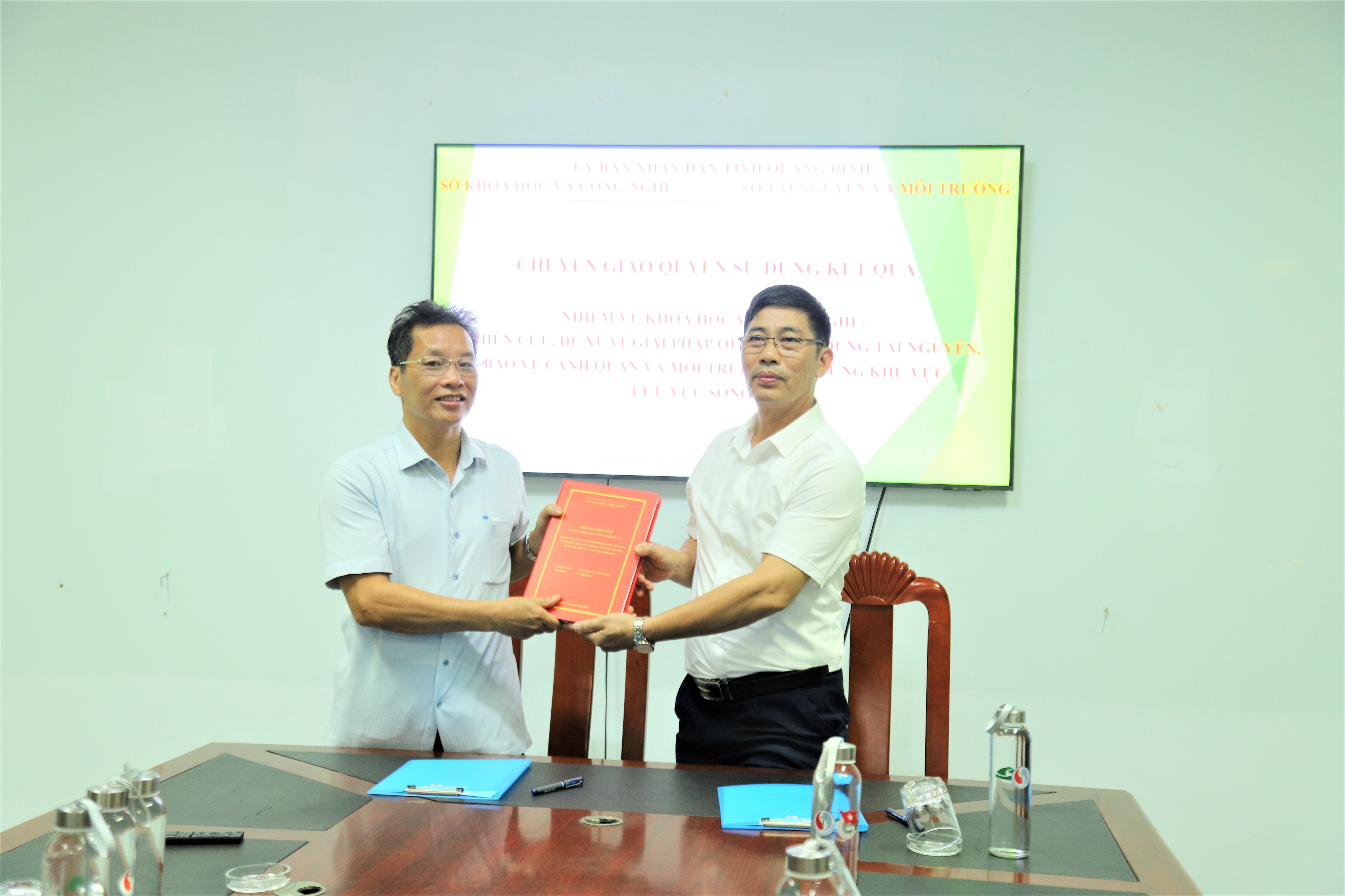 Theo đó, trong đợt này, các nhiệm vụ được Sở KH&CN chuyển giao, gồm: Nhiệm vụ: “Nghiên cứu, đề xuất giải pháp quản lý, sử dụng tài nguyên, bảo vệ cảnh quan và môi trường bền vững lưu vực sông Son” đơn vị nhận chuyển giao là Sở Tài nguyên và Môi trường; Nhiệm vụ: “Nghiên cứu, đề xuất giải pháp bảo tồn, phát huy giá trị các di sản phi vật thể tiêu biểu trên địa bàn tỉnh Quảng Bình” đơn vị nhận chuyển giao là Sở Văn hóa và Thể thao; Nhiệm vụ: “Nghiên cứu quá trình hình thành, phát triển và đề xuất giải pháp bảo tồn, phát huy các giá trị di tích lịch sử lực lượng vũ trang Quảng Bình giai đoạn 1945-1975 phục vụ phát triển du lịch” 2 đơn vị nhận chuyển giao là Sở Văn hóa và Thể thao và Bảo tàng Tổng hợp tỉnh Quảng Bình; Dụ án sản xuất thử nghiệm: “Sản phẩm dinh dưỡng sâm Bố Chính sấy dẻo từ sâm Bố Chính tươi” 2 đơn vị nhận chuyển giao là Sở Nông nghiệp & PTNT và Công ty Trách nhiệm hữu hạn Nông nghiệp công nghệ cao Tuệ Lâm; Nhiệm vụ: “Đánh giá tỷ lệ, yếu tố liên quan và một số biến chứng của bệnh tiền đái tháo đường mới phát hiện ở người lớn từ 20-60 tuổi tại tỉnh Quảng Bình” 2 đơn vị nhận chuyển giao là Sở Y tế Quảng Bình và Trường Cao đẳng Y tế Quảng Bình.