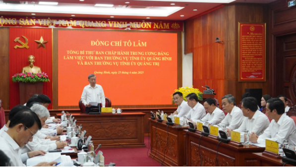 Tổng Bí thư Tô Lâm phát biểu tại buổi làm việc với lãnh đạo hai tỉnh Quảng Bình, Quảng Trị ngày 25/6/2025 - Ảnh: N.M