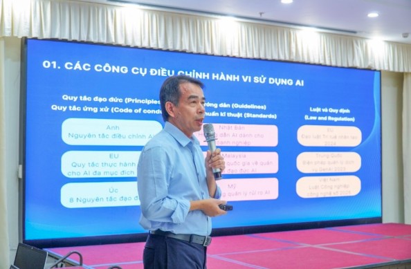 Ông Nguyễn Đức Lam, cố vấn chính sách Viện IPS, giới thiệu về Bộ quy tắc Sử dụng AI có trách nhiệm trong Truyền thông số. Ảnh: BTC