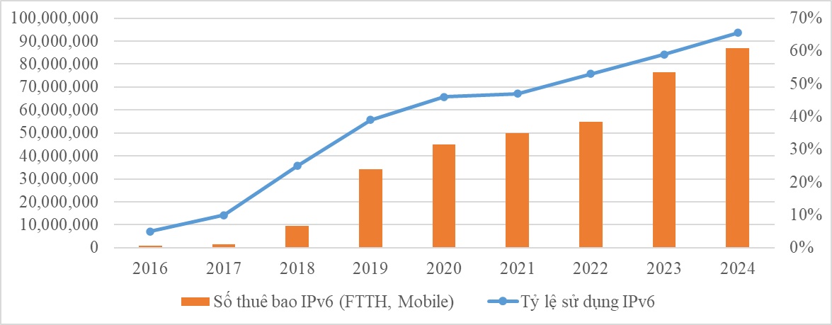 Theo số liệu cập nhật tháng 12/2024, tỷ lệ sử dụng địa chỉ Internet thế hệ mới (IPv6) đạt 65.5%.