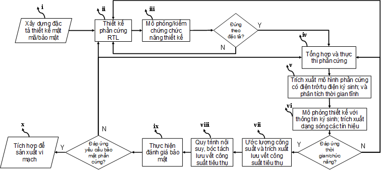 Quy trình được bảo hộ sáng chế bao gồm các bước từ đặc tả thiết kế, mô tả kiến trúc RTL, mô phỏng chức năng, tổng hợp phần cứng, phân tích thời gian và ký sinh, đến ước lượng công suất tiêu thụ và phân tích bảo mật thông qua các kỹ thuật thống kê như T-test, phân tích vi sai (DPA) và phân tích tương quan (CPA). Toàn bộ quy trình được thực hiện trên mô hình thiết kế trước khi gửi đi chế tạo, giúp tiết kiệm đáng kể chi phí và phát hiện sớm các điểm yếu bảo mật có thể bị khai thác.