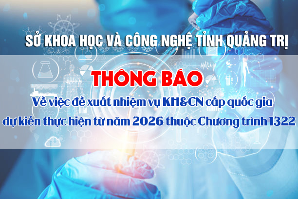 Sở Khoa học và Công nghệ tỉnh Quảng Trị thông báo đến các cơ quan, đơn vị để thực hiện đề xuất nhiệm vụ khoa học và công nghệ cấp Quốc gia thực hiện từ năm 2026 thuộc Chương trình 1322 gửi văn bản đề xuất về Sở Khoa học và Công nghệ trước ngày 10/8/2025 để tổng hợp trình UBND tỉnh đề xuất Bộ Khoa học và Công nghệ.