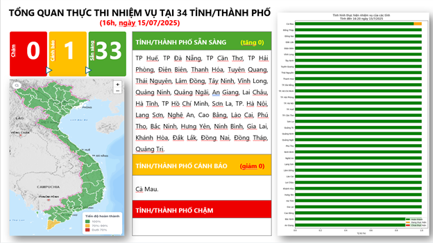 Tính đến ngày 15/7/2025, đã có 33/34 tỉnh, thành phố đã đạt trạng thái XANH trên bản đồ giám sát theo dõi, tổng hợp tình hình triển khai Kế hoạch số 02-KH/BCĐTW về thúc đẩy chuyển đổi số liên thông, đồng bộ, nhanh, hiệu quả đáp ứng yêu cầu sắp xếp tổ chức bộ máy của hệ thống chính trị.