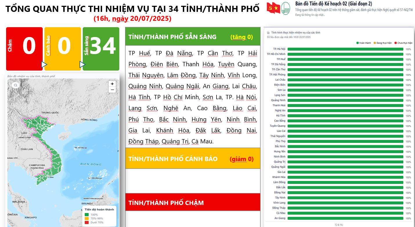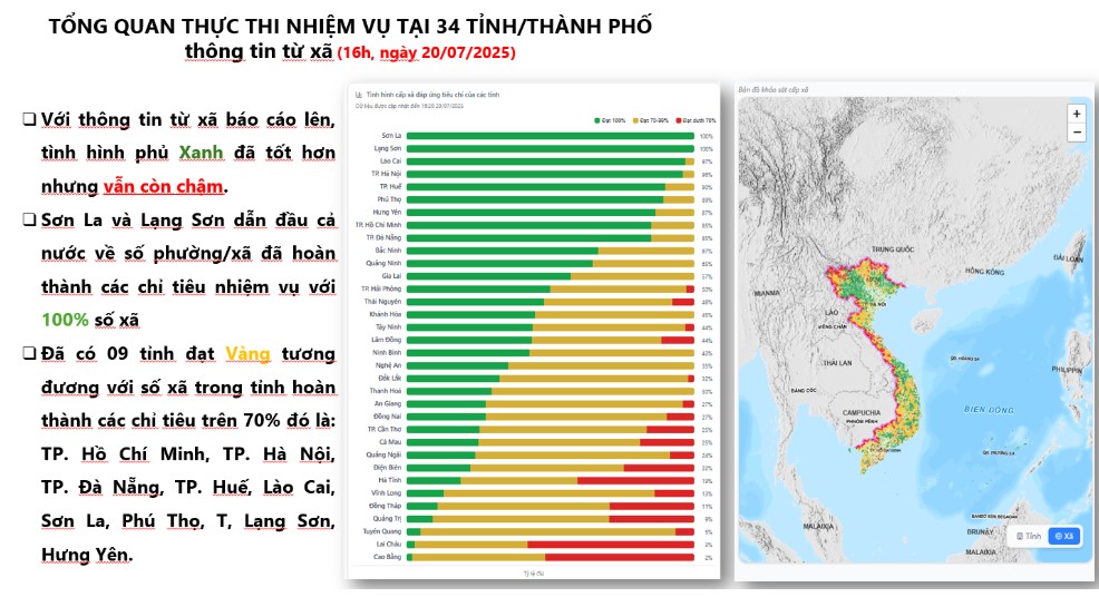 Tính đến 16h00 ngày 20/7/2025, bản đồ nhiệt trên hệ thống giám sát cho thấy 34/34 tỉnh, thành phố trong cả nước đều đạt trạng thái XANH, tức đã hoàn thành đúng tiến độ các nhiệm vụ phải hoàn thành trước ngày 01/8/2025. Đặc biệt, tỉnh Sơn La và Lạng Sơn đã đạt tỷ lệ 100% số xã, phường phủ xanh cho thấy sự nỗ lực quyết liệt từ cấp cơ sở.