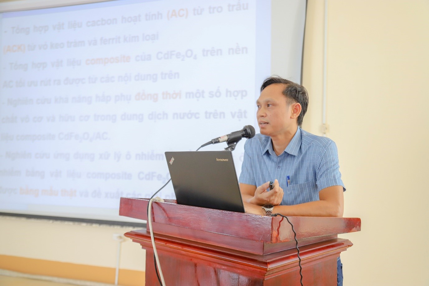 Dưới sự chủ trì của TS. Võ Khắc Sơn, Phó Hiệu trưởng Trường Đại học Quảng Bình, hội thảo đã nghe nhóm nghiên cứu báo cáo chi tiết các nội dung triển khai: từ tổng quan về cacbon hoạt tính và cadimi ferit; nghiên cứu tổng hợp cacbon hoạt tính từ vỏ trấu và keo tràm; tối ưu điều kiện tổng hợp CdFe₂O₄ kích thước nano bằng phương pháp thủy nhiệt; đến chế tạo vật liệu composite CdFe₂O₄/AC và thử nghiệm khả năng hấp phụ, đồng thời các hợp chất vô cơ, hữu cơ trong nước, nhằm đề xuất giải pháp xử lý hiệu quả nguồn nước sinh hoạt, đặc biệt ở khu vực nông thôn, miền núi.