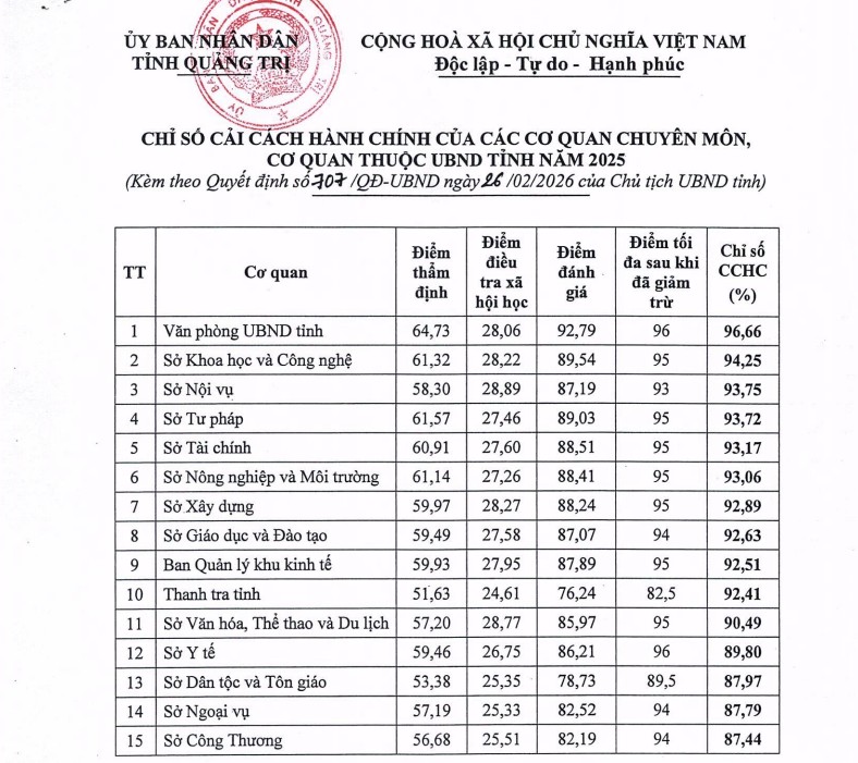 Theo kết quả công bố Chỉ số cải cách hành chính năm 2025 đối với các cơ quan chuyên môn thuộc UBND tỉnh Quảng Trị, Sở Khoa học và Công nghệ tỉnh Quảng Trị vinh dự xếp thứ 2 trong bảng xếp hạng. Kết quả này không chỉ khẳng định vị thế của đơn vị trong hệ thống các cơ quan chuyên môn, mà còn phản ánh rõ nét những chuyển biến tích cực, thực chất trong công tác quản lý, điều hành và phục vụ người dân, doanh nghiệp.